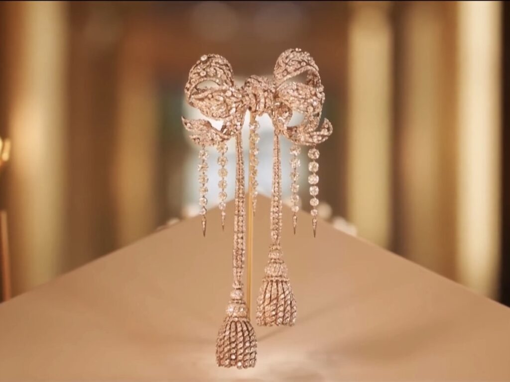 | ウジェニー皇后の宝飾品 | ナポレオン3世の妻。盗まれたのはダイヤモンドのティアラ、「グラン・ヌー・ド・コルサージュ」(大きな胴着の結び目)と呼ばれるブローチ、および「レリクエール」と呼ばれるブローチ(94個のダイヤモンドを含む)の3点。 | ウジェニー皇后は、ファッションと第二帝政のスタイルを象徴する人物であり、公の場では宝石を権力の象徴として常に身につけていた。 |