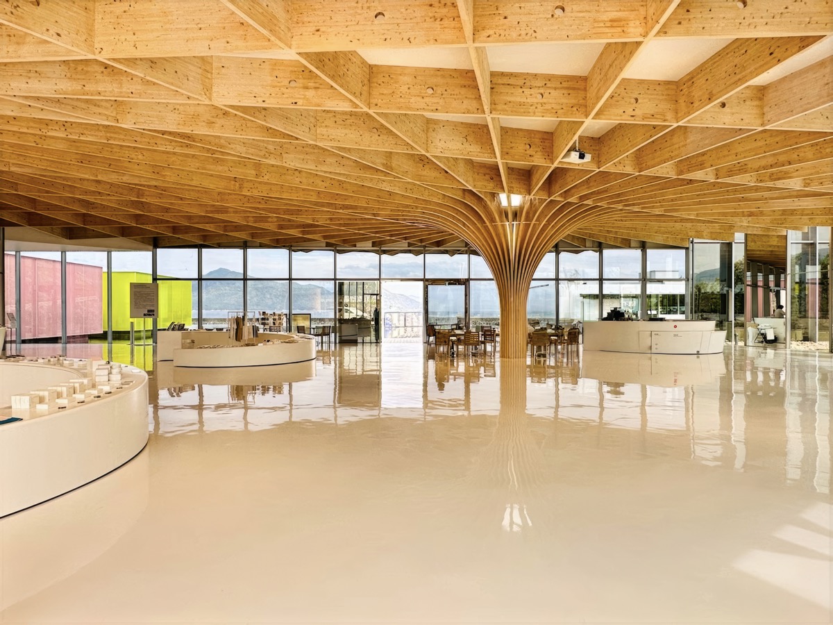 内部に入ると視界が開け、ガラス越しに多島海の起伏が連続して見えます。床・壁・天井の木質仕上げは視覚と嗅覚の両面で落ち着きを与え、放射状に配された柱と梁が視線を自然に上へ導きます。空間を必要以上に誇張せず、歩行のリズムに合わせて奥行きを把握できる構成です。