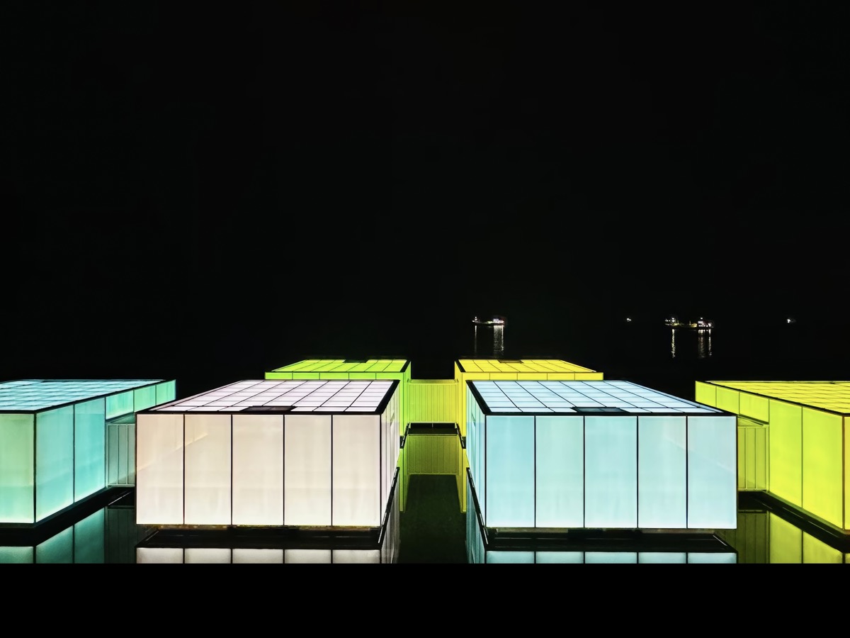 エントランスを抜けると、水盤上に等間隔で並ぶ八つの展示キューブが現れます。背後のハーフミラーと水面の反射が視界をゆるやかに伸ばしますが、演出は抑制的です。水位や風向き、時間帯の変化によって見え方が少しずつ変わり、来館のたびに新たな表情を見せてくれます。